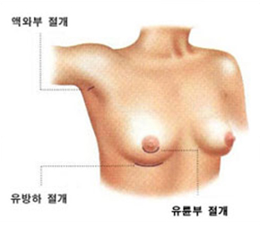 유방아래주름 절개, 유륜주위 절개, 겨드랑이 절개, 배꼽주위 절개가 있습니다.
