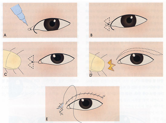 ② 과잉 조직을 제거하기 용이하므로 동양인의 위눈꺼풀처럼 피부가 늘어져 있고 그 두께가 두꺼운 경우에 적용하기 적당합니다.