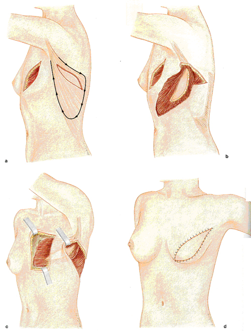 겨드랑이의 앞주름을 만들어 줄 수 있으며 수술 후 등이나 팔의 운동에는 큰 지장이 없습니다. 수술 흉터는 남게 되지만 최대한 브래지어 위치에 맞추어 눈에 띄지 않도록 합니다. 그러나 과거에 흉부외측으로 수술을 받았던 환자, 겨드랑이 부위에 방사선 치료를 받았던 환자나 유방이 큰 환자에서는 사용하기 힘든 단점이 있습니다.