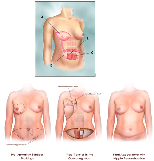 수술방법은 배의 복직근 일부와 지방/피부를 타원형으로 절제하고 혈관과 함께 분리하여 재건할 유방쪽으로 옮긴 후 유방 주위의 혈관과 배 조직에서 가져온 혈관을 미세혈관술을 이용하여 문합한 후 배의 조직을 알맞게 유방에 고정하는 방법입니다. 배 부분은 당겨서 봉합을 하고 배꼽은 당겨진 배 부위에 다시 만들어 줍니다. 최근 가장 많이 시행되고 있는 방법입니다.