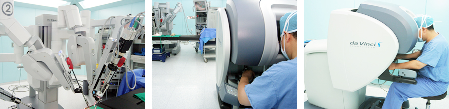 복강경 수술로봇 시스템인 다빈치 로봇은 환자의 몸에 몇 개의 작은 구멍을 뚫어 이곳을 통해 수술용 카메라와 로봇팔을 넣어 수술합니다. 의사가 로봇 조작 장치(콘솔)에서 수술할 때와 같은 손동작으로 로봇팔을 조정해 수술이 진행됩니다. 다빈치 수술은 2차원 영상으로 수술 부위를 볼 수 있는 기존의 복강경 수술과 달리, 수술부위를 15배 크기로 확대한 고화질의 3차원 영상으로 구현됩니다. 따라서 장기, 혈관, 신경 등 해부학적인 구조물들을 정확히 확인할 수 있어 정밀하고 정확한 수술이 가능합니다.기존의 복강경 수술은 기구가 직선형이고, 기구의 끝이 고정돼 움직이는 각도에 제한이 있어 몸의 깊은 곳을 수술하는데 어려움이 많았습니다. 하지만 다빈치 로봇은 뛰어난 인체 공학적인 기구로 사람의 손과 팔처럼 자유자재로 움직일 수 있을 뿐만 아니라 손떨림 현상이 전혀 없고 양손을 자유자재로 사용할 수 있기 때문에 몸 깊숙한 곳의 수술에도 용이합니다.이 때문에 다빈치 로봇수술은 기존의 복강경 수술과 비교해 입원 기간이 짧고 수술 후 흉터가 거의 없으며, 수술 후 통증이 매우 적어 회복 속도가 빠를 뿐만 아니라 수술 중 발생할 수 있는 혈관이나 신경의 손상 등 합병증이 현저히 적어 현대 의학에서 각광을 받고 있는 수술입니다.